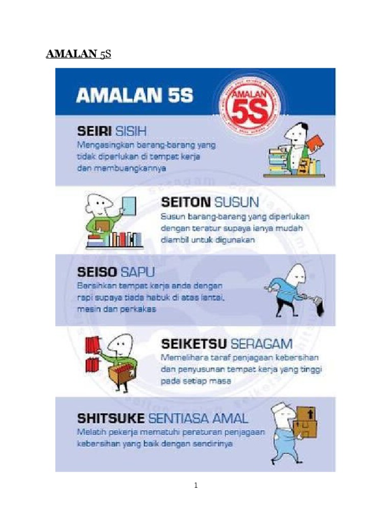 We would like to show you a description here but the site wont allow us. Penjelasan umum penerapan 5r 5s tersebut antara lain. Evaluasi kembali terhadap 5s dan lakukan tindakan pencegahan agar 5s tetap terjaga di tempat kerja. Maksud dari seiso seweep and clean di konsep 5s adalah membersihkan area tempat kerja setiap saat misalnya dengan melakukan pembersihan sisa fabrics debu dan kotoran lain setiap awal 5 menit sebelum kerja dan 5 menit sebelum pulang setiap hari. Program 5s ini sudah dikembangkan di jepang dan negara negara lainnya. Pada artikel sebelumnya yang bisa anda lihat disini kami sudah memberikan informasi terkait materi training 5s.