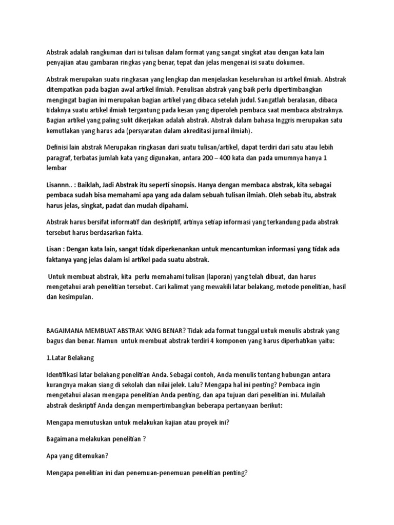 Kedudukan abstrak sangatlah penting bahkan bisa dibilang wajib di dalam sebuah karya ilmiah. Setiap cara membuat abstrak yang dibuat terdiri dari tiga paragraf. Inilah contoh abstrak skripsi yang baik dan benar pentingya abstrak tentu didasarkan dari tujuan utamanya untuk menghubungkan antara pemikiran dari penulis dengan pembaca skripsidengan begitu setelah membaca abstrak diarapkan para pembaca dapat menyelami keseluruhan isi skripsi. Idealnya abstrak harus sesuai dengan seluruh format esai yang anda tulis secara umum meliputi pendahuluan isi dan kesimpulan. Contoh abstrak karya ilmiah baik itu skripsi jurnal tesis disertai dan lain sebagainya selalu menuntut penulisnya untuk membuat abstrak.