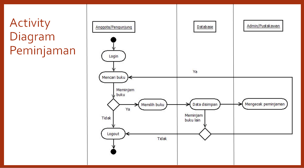 Umumnya peminjam harus terdaftar sebagai anggota perpustakaan serta memiliki kartu anggotanya kemudian peminjam baru bisa meminjam buku buku tersebut. Activity diagram perpustakaan malam nakama kalau kemarin sudah sharing tentang use case diagram selanjutnya akan dibagikan mengenai activity diagram. Belajar teks negosiasi pengertian struktur isi ciri bahasa langkah penulisan dan contoh teks negosiasi yang benar desember 19 2019. Pada kesempatan kali ini kita bakal mengupas tuntas tentang use case diagram lengkap dengan studi kasus dan contoh pemodelan use case nya. Cara download aplikasi esmart bni sekuritas. Sistem yang sedang berjalan current system sistem peminjaman buku di perpustakaan saat ini masih dilakukan secara manual.