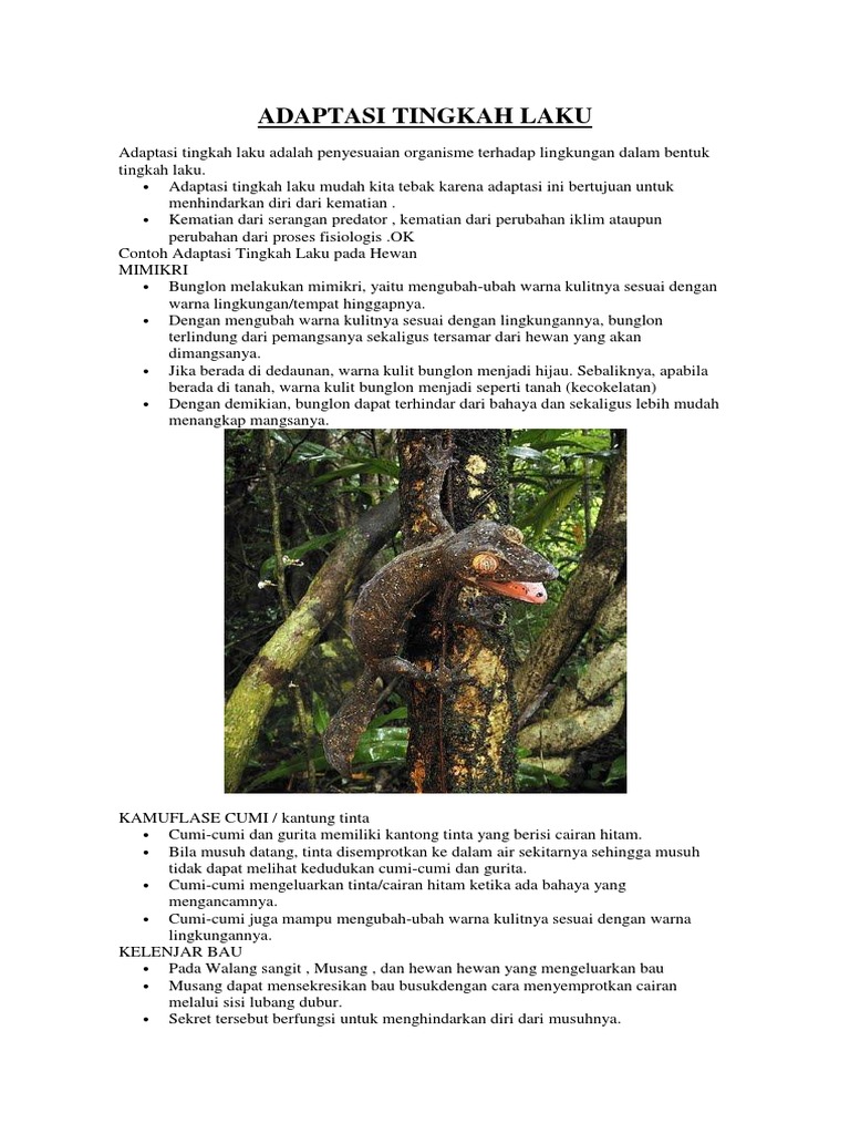 Adaptasi tingkah laku ialah kegiatan atau tingkah laku hewan yang menyesuaikan dengan kondisi lingkungan untuk membantunya bertahan hidup. Adaptasi tingkah laku bisa berupa hasil belajar ataupun instingnaluri sejak lahir. Macam macam adaptasi tingkah laku. Adaptasi rayap rayap merupakan salah satu contoh hewan yang. Adaptasi tingkah laku mempunyai 2 macam tingkah laku yaitu sebagai berikut. Adaptasi tingkah laku adaptasi adalah cara organisme atau makhluk hidup menyesuaikan diri terhadap lingkungannya.
