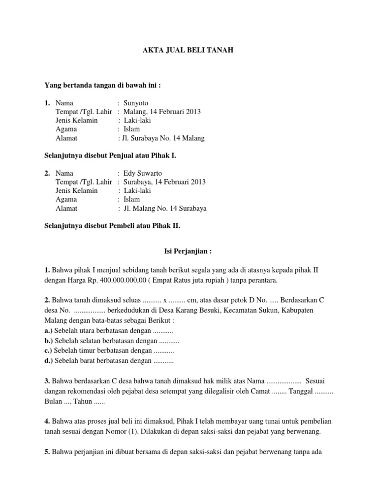 Akta jual beli ajb merupakan dokumen yang membuktikan adanya peralihan hak atas tanah dari pemilik sebagai penjual kepada pembeli sebagai pemilik baru. 35 contoh surat perjanjian jual beli mobil. Jika harga jual beli tanah belum dibayar lunas maka pembuatan ajb belum dapat dilakukan. Contoh akta jual beli rumah dan tanah. 44 desa purwodadi kabupaten klaten dengan pihak pihak sebagai berikut. Dalam proses transaksi jual beli rumah maupun jual beli apapun yang memiliki nilai jual tinggi sebaiknya digunakan contoh surat perjanjian jual beli rumah dengan 11 pasal berikut ini.