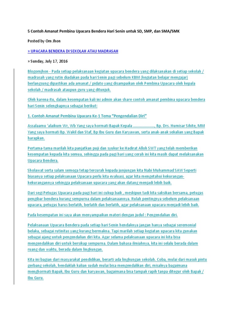 Assalaamu alaikum wr wb yang saya hormati bapak kepala sma negeri 22 jakarta bp. Contoh naskah amanat pembina upacara bendera hari senin pada jenja ng pendidikan sdmi sltpmts smaman upacara bendera merupakan sesuatu yang biasa dilakukan namun apakah kita tahu apa itu upacara bendera. Pada tingkat sd smp maupun sma setiap pagi senin pasti mengadakan upacara bendera. 6 contoh amanat pembina upacara sd smp sma yang menarik. Contoh amanat pembina upacara ke 1.