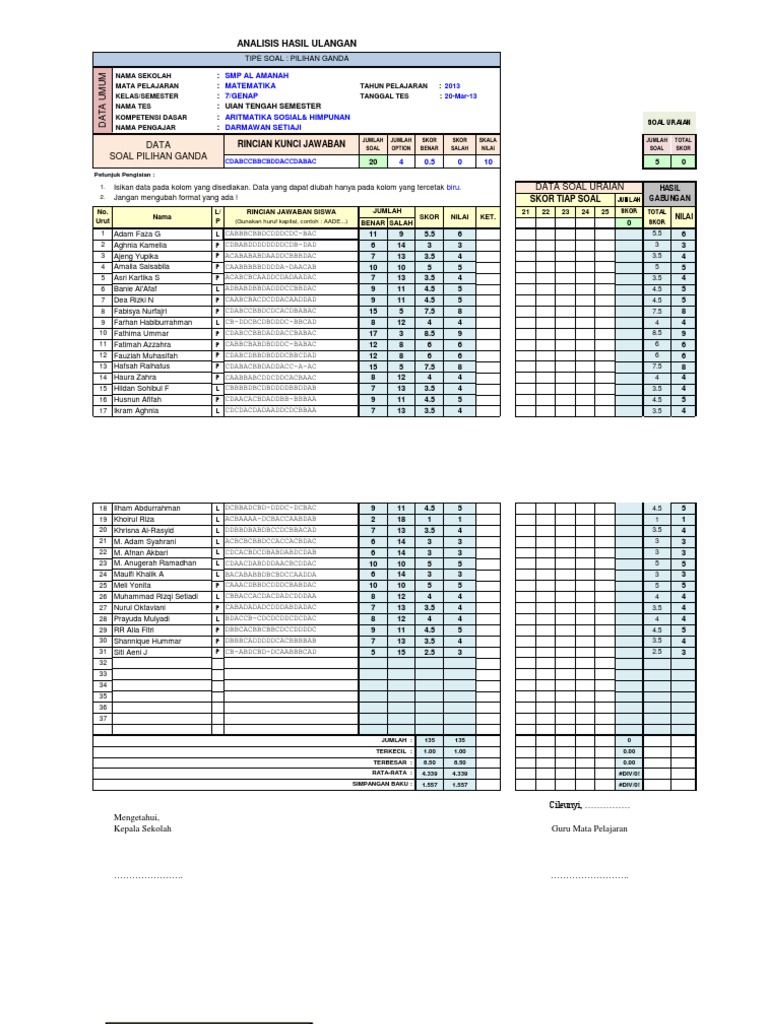 Contoh analisis butir soal. Format analisis butir soal pilihan ganda dan essay dengan excel 2018 ini merupakan sebuah aplikasi atau format excel yang sudah diberi rumus sehingga memudahkan anda dalam menganalisis soal hanya dengan meng entry jawaban siswa dan jawaban seharusnya. Contoh file soal uts lengkap kelas 1 6 sdmi semua mata pelajaran 20162017 berikut ini adalah kumpulan dari berbagi sumber tentang contoh analisis butir soal ipa smp yang bisa gunakan untuk bank soaldownloadsd dan diunduh secara gratis dengan menekan tombol download biru dibawah ini. Analisis validitas reliabilitas daya pembeda tingkat kesukaran dsb pada soal ujian sd. Dengan format analisis butir soal dengan excel 2018 ini anda dapat dengan mudah membuat analisis soal tanpa menghitung manual dengan rumus. Analisis butir soal secara klasik adalah proses penelaahan butir soal melalui informasi dari jawaban peserta tes guna meningkatkan mutu butir soal yang bersangkutan dengan menggunakan teori tes klasik. Analisis hasilanalisis butir soal kegiatan menganalisis butir soal merupakan suatu kegiatan yang harus dilakukan guru untuk meningkatkan mutu soal yang telah ditulis.