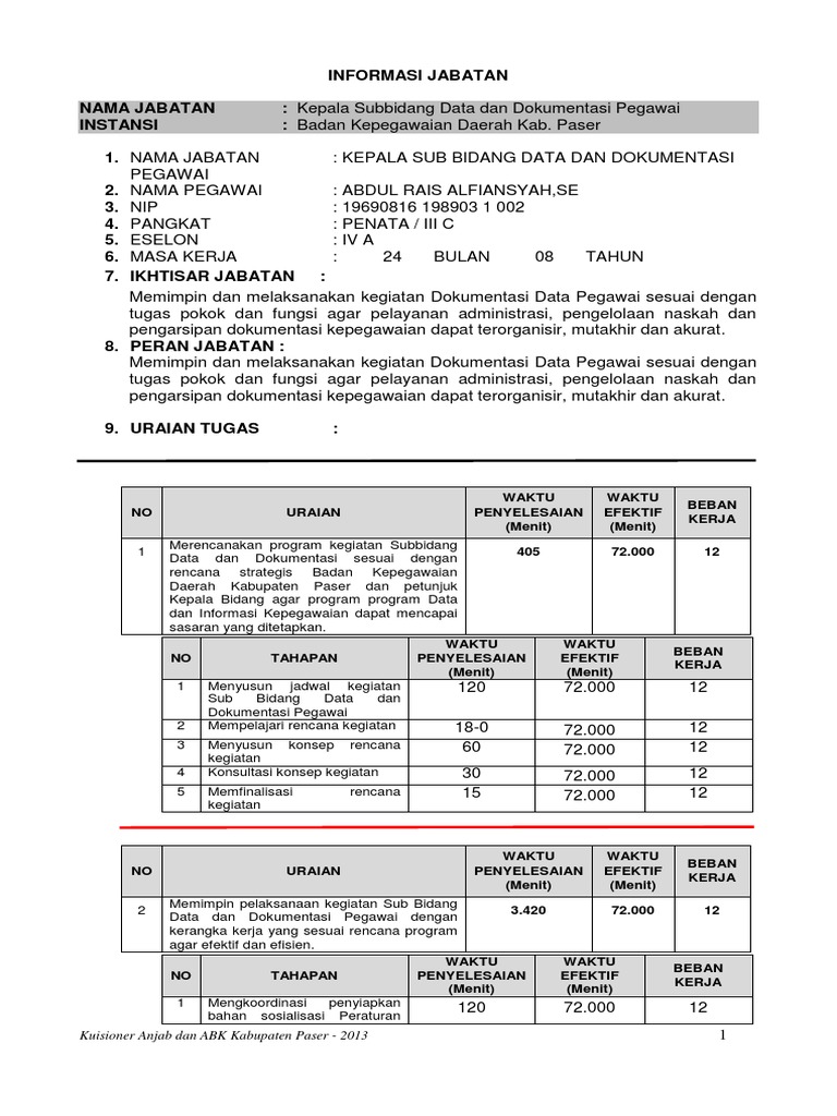 Berdasarkan metode analisis jabatan merumuskan data yang diperlukan untuk analisis jabatan membuat daftar pertanyaan yang akan digunakan dalam analisis jabatan menganalisis datainformasi jabatan pegawai negeri sipil pns dalam rangka penyusunan daftar jabatan membuat laporan hasil analisis jabatan tatacara. Berikut ini contoh analisis jabatan anjab untuk guru mapel matematika. 28 junl2011 pedoman pelaksanaan analisis jabatan i. Untuk memperlancar dan mempermudah dalam penyusunan analisis jabatan dan analisis beban kerja khusus bagi jabatan pelaksana agar beredoman pada peraturan menteri pendayagunaan aparatur negara dan reformasi birokrasi nomor 25 tahun 2016 tentang nomenklatur jabatan pe aksana bagi pns di lingkungan lnstansi pemerintah. Dinas bagianbadan xxxxxxxxeselon i. Supaya tampilan maksimal silahkan akses melalui desktopkomputer.