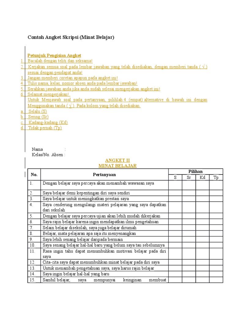 Saya tidak pernah mencontek ketika ulangan harian. Contoh angket atau kuesioner terbaru sebelum kita membahas jauh tentang kuesioner ini marilah kita bahas terlebih dahulu apa pengertian angket sehingga kita dapat menyamakan persepsi kemudian kita akan melanjutkan apa kegunaan fungsi dari angket kuesioner. Contoh angket skripsi minat belajar petunjuk pengisian angket. Saya suka duduk dibelakang karena jauh dari pantauan guru. Bacalah dengan cermat setiap pernyataan tersebut. Angket ini berisi 44 item pernyataan tentang motivasi belajar.