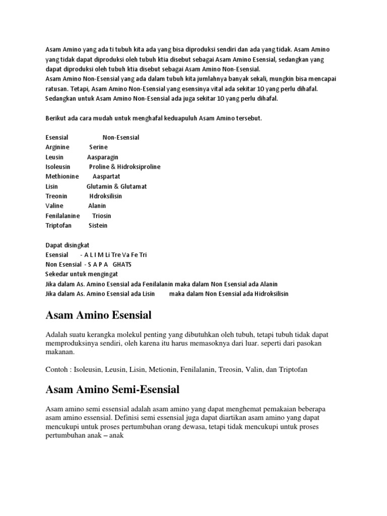 Contoh asam amino esensial. Asam amino ini juga membantu dalam penyerapan kalsium produksi protein otot produksi hormon pemulihan dari trauma pada jaringan tubuh dan produksi antibodi dan enzim. Asam amino karnitina juga bersifat setengah esensial dan sering diberikan untuk kepentingan pengobatan. Arginin adalah asam amino esensial yang diperlukan tubuh untuk pembuatan cairan seminal air mani dan memperkuat sistem imun. Asam amino esensial ini dibutuhkan untuk pertumbuhan tubuh manusia. Yang lain harus disediakan dalam makanan. Beberapa asam amino merupakan asam amino yang esensial secara nutrisi yaitu asam asam amino ini harus didapatkan dari makanan sedangkan asam amino lainnya dapat di sintesis in vivo dalam jumlah yang cukup untuk memenuhi kebutuhan metabolismeasam amino terdiri dari dua macam yaitu asam amino esensial dan asam amino nonesensial.