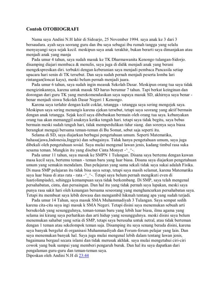 Contoh autobiografi diri sendiri 2 aku lahir di papua 12 januari 1997 namun saat ini aku tinggal di kota jakarta dan menjadi salah satu siswa di kelas x sma negeri 21 jakarta jurusan ips. Contoh autobiografi panjang. Sekarang dia masih sekolah di sma negeri 6 balikpapan. Saya lahir di sebuah kampung kecil yang bernama meranti bunting pada tanggal 20 oktober 1997. Tapi teman teman di sekolah. Saat ini saya tinggal di kabupaten bekasi.