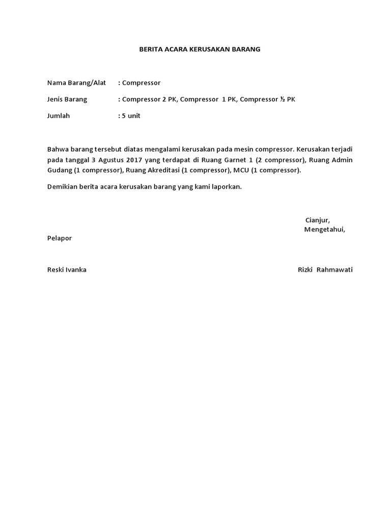 Contoh berita acara kerusakan barang. Demikianlah berita acara ini dibuat oleh kedua belah pihak serta barang barang tersebut dalam kondisi baik layak dan cukup sejak penandatanganan berita acara ini maka barang tersebut menjadi tanggung jawab pihak kedua untuk menyimpan memelihara merawat dengan baik serta dipergunakan untuk keperluan tempat dimana barang itu dibutuhkan. Form berita acara kerusakan barang by isyafutra. Lebih dari sekadar dokumen. Contoh berita acara barang rusak berat. Jika anda mencari contoh berita acara barang rusak maka anda berada di tempat yang tepatblog contohoha memiliki banyak koleksi gambar seperti contoh berita acara barang rusak gambar ini tersedia dalam format jpg png gif. Selain itu gambar ini juga memiliki berbagai ukuran.