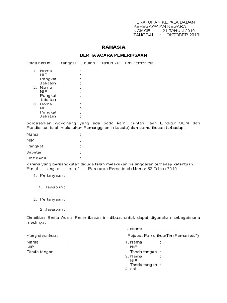 Contoh berita acara pemeriksaan. Demikian berita acara ini kami buat dengan sebenar benarnya untuk dapat dipergunakan sebagaimana mestinya. Tujuan dari berita acara tersebut adalah sebagai bukti legal yang tertulis atas sebuah transaksi atau peristiwa tertentu. Para pihak pihak pertama pihak kedua. Contoh berita acara berita acara merupakan bukti legal yang didalamnya mengandung suatu pengesahan atau pernyataan di dalam sebuah acara kejadian atau peristiwa serah terima jual beli transaksi insiden dan masih banyak lagi yang lainnya. Berikut informasi sepenuhnya tentang contoh berita acara pemeriksaan pelanggaran disiplin pegawai. Meskinya setiap dari kita harus tahu karena berita acara ini benar benar penting bagi kita terutama ketika hendak menjalin kerja sama dengan orang lain entah itu dengan individu maupun kelompok.