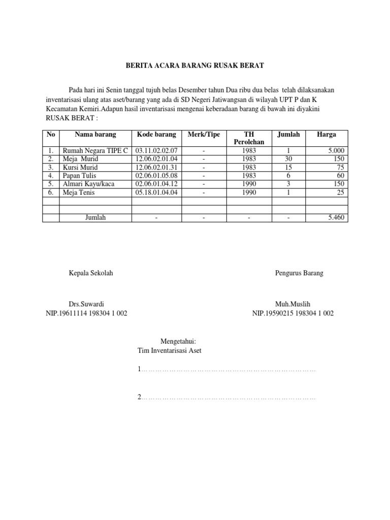 Perwakilan dari pusat rsmnsminternal audit fm cbg log 04 revisi 00. Barang tersebut telah diperiksa dan terdapat rusakcacat produksi dan tidak memungkinkan untuk digunakan kembali. Bagi suatu permasalahan masalah baik berupa pelaksanaan perencanaan ataupun pengendalian kebijaksaan pimpinan. T indak lanjut berdasarkan keputusan dari manajemen yang menyatakan bahwa barang barang tersebut dimusnahkan atau disingkirkan dari area kerja maupun lingkungan perusahaan maka pada pelaksanaanya memerlukan pembuatan catatan berita acara yang sekurang kurangnya memuat. Baik itu menyangkut rapat kehilangan kerusakan serah terima barang peristiwa penyelesaian pekerjaan perubahan status dan masih banyak lagi lainnya. Berita acara pemusnahan barang.