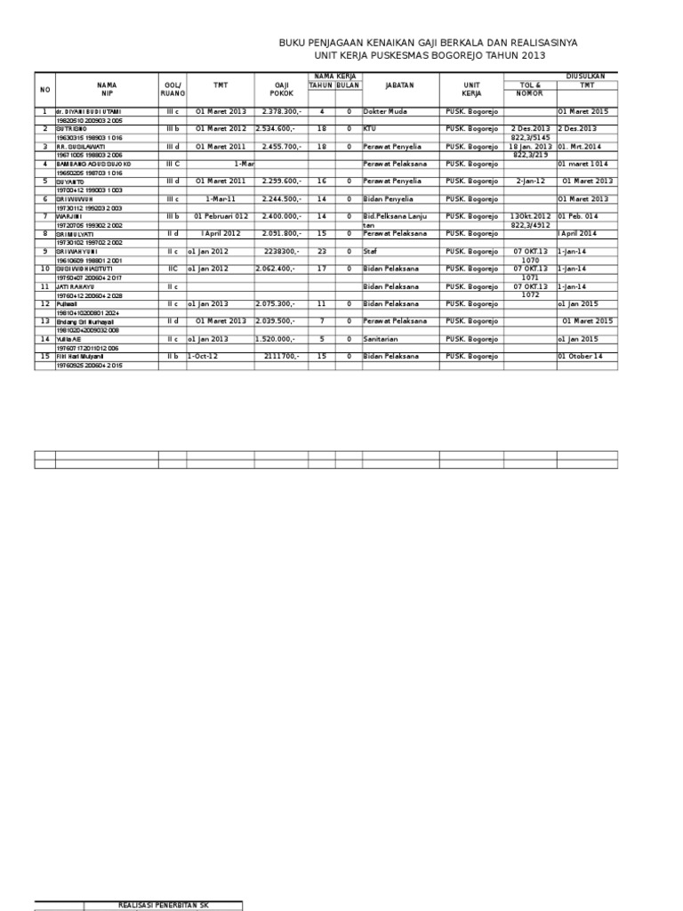 Buku kendali kenaikan pangkat kenaikan gaji berkala dan pensiun. Buku induk pegawai apakah sesuai dengan ketentuan se bakn. Buku induk pegawaibuku register pegawai. Kgb sekolah pp 34 th 2014 font calibridocx. Kenaikan gaji berkala untuk pertama kali bagi seorang pegawai negeri sipil diberikan setelah mempunyai masa kerja 2 dua tahun sesuai tmt dan masa kerja pada sk pengangkatan. Surat kenaikan gaji berkala tahun 2018 ini hanya sebagai contohreferensi yang baik dan benar bagi bapakibu guru pns yang ingin mengajukan permohonan kepada bupatiwalikota setempat.