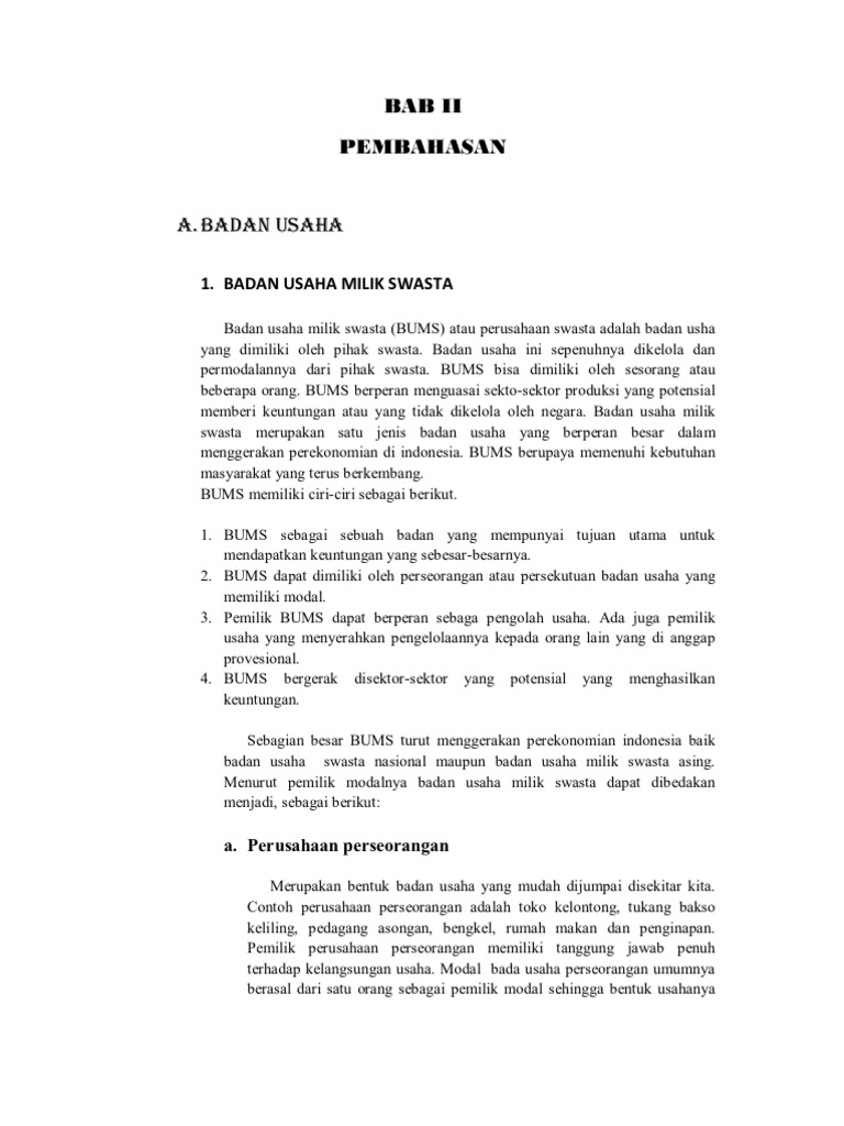 Ia mengelola usahanya sendiri dengan modal yang diperoleh dari tabungan serta melakukan manajemen usahanya secara pribadi sesuai dengan yang ia inginkan. Badan usaha tersebut menjalankan fungsi dan peranannya dalam peningkatan perekonomian indonesia. Contoh badan usaha milik swasta bums yang ada di indonesia adalah sebagai berikut yaitu. Usaha ini dimodali dimiliki dan di bawah tanggung jawab satu orang warga. Contoh bums di indonesia bums adalah singkata badan usaha milik swasta. Djarum tbk merupakan perusahaan yang bergerak dalam bidang industri rokok terbesar di indonesia sejak 60 tahun yang lalu.