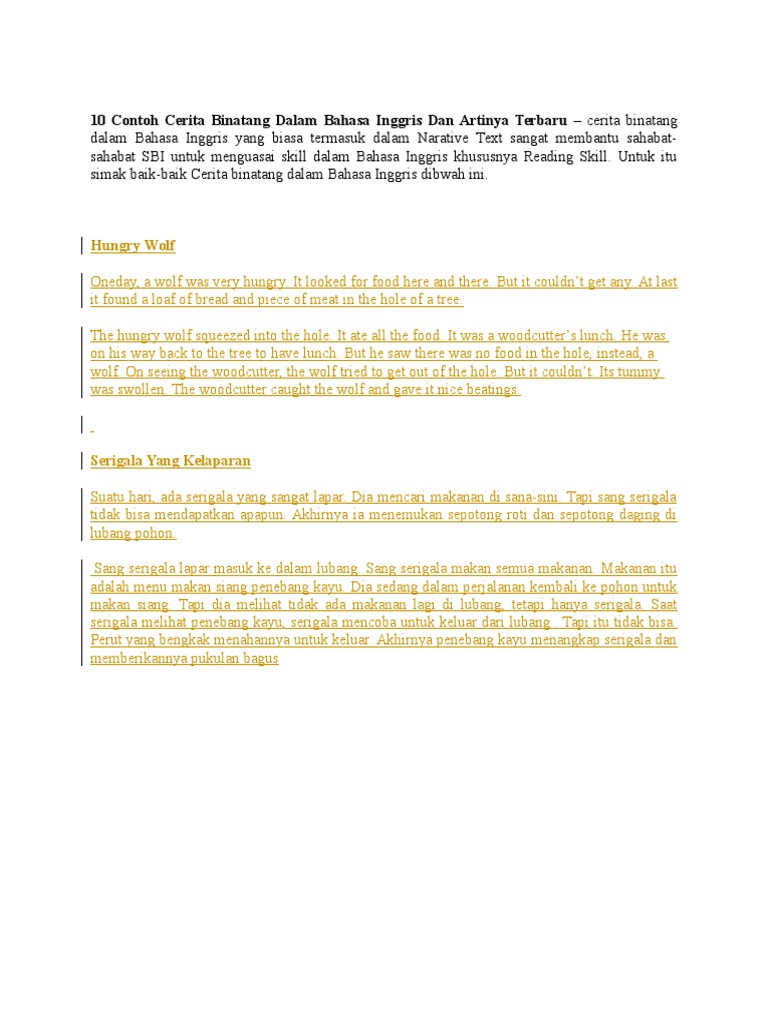Contoh cerita bahasa inggris. 9 contoh teks short story telling dalam bahasa inggris beserta artinya story telling is the interactive art of using words and action to reveal the elements and images of 9 contoh teks short story telling dalam bahasa inggris dan artinya lengkap story telling biasanya menceritakan tentang legenda yaitu cerita rakyat ataupun. Royal prince raden putras papa was the king of the kingdom. They were prince raden putra and also dewi limaran. The boy was called malin kundang. A small thing costs much. Untuk itu simak baik baik cerita binatang dalam bahasa inggris dibwah ini.