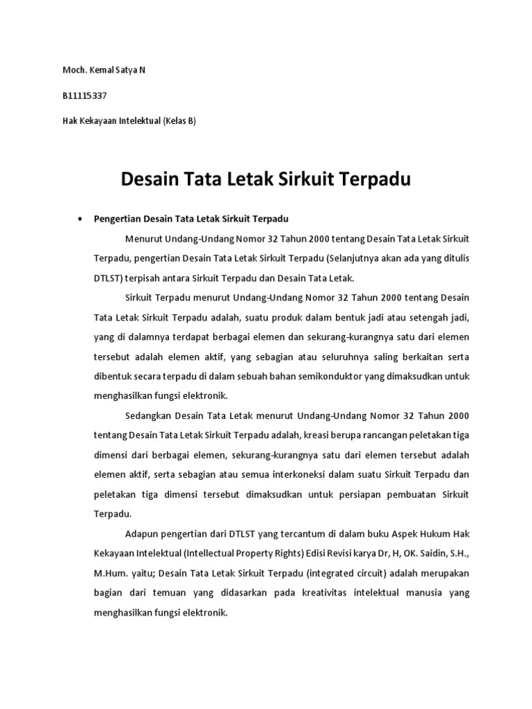 Desain tata letak sirkuit terpadu adalah kreasi berupa rancangan peletakan tiga dimensi dari berbagai elemen sekurang kurangnya satu dari elemen tersebut adalah elemen aktif serta sebagian atau semua interkoneksi dalam suatu sirkuit terpadu dan peletakan tiga dimensi tersebut dimaksudkan untuk persiapan pembuatan sirkuit terpadu. Efi frihartini nim. Desain tata letak sirkuit terpadu sebagai bagian dari sistem hak kekayaan intelektual diatur dengan undang undang. Admin blog temukan contoh 2019 juga mengumpulkan gambar gambar lainnya terkait contoh kasus desain tata letak sirkuit terpadu dibawah ini. Desain tata letak sirkuit terpadu integrated circuit adalah merupakan bagian dari temuan yang didasarkan pada kreativitas intelektual manusia yang menghasilkan fungsi elektronikistilah integrated circuit ic adalah merupakan istilah yang dikenal dalam teknik digitalic adalah merupakan komponen elektronik yang terdiri dari kombinasi transistor diode resistor dan kapasitor. Desain tata letak sirkuit terpadu dtlst desain tata letak sirkuit terpadu merupakan bagian dari temuan yang didasarkan pada kreativitas intelektual manusia yang menghasilkan fungsi elektronik.