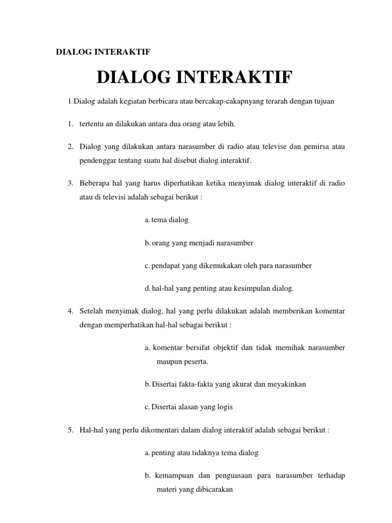 Pengertian ciri ciri struktur jenis dan unsur kebahasaan. Contoh dialog interaktif singkat tentang pendidikan pengertian dialog interaktif dialog interaktif adalah suatu kegiatan diskusi yang membahas suatu topik tertentu baik dilakukan di acara televisi radio maupun forum forum umum yang melibatkan pendengar untuk menanyakan dan menanggapi isi dari pembicaraan dialog tersebut. Contoh dialog interaktif singkat 2018 beserta kesimpulannya acara hitam putih terbaru tv one tentang pendidikan kebersihan dll. Contoh dialog interaktif singkat tentang kebersihan. Artikel kali ini pun juga akan menyajikan contoh dialog 2orang dengan tema khusus yaitu pendidikan.