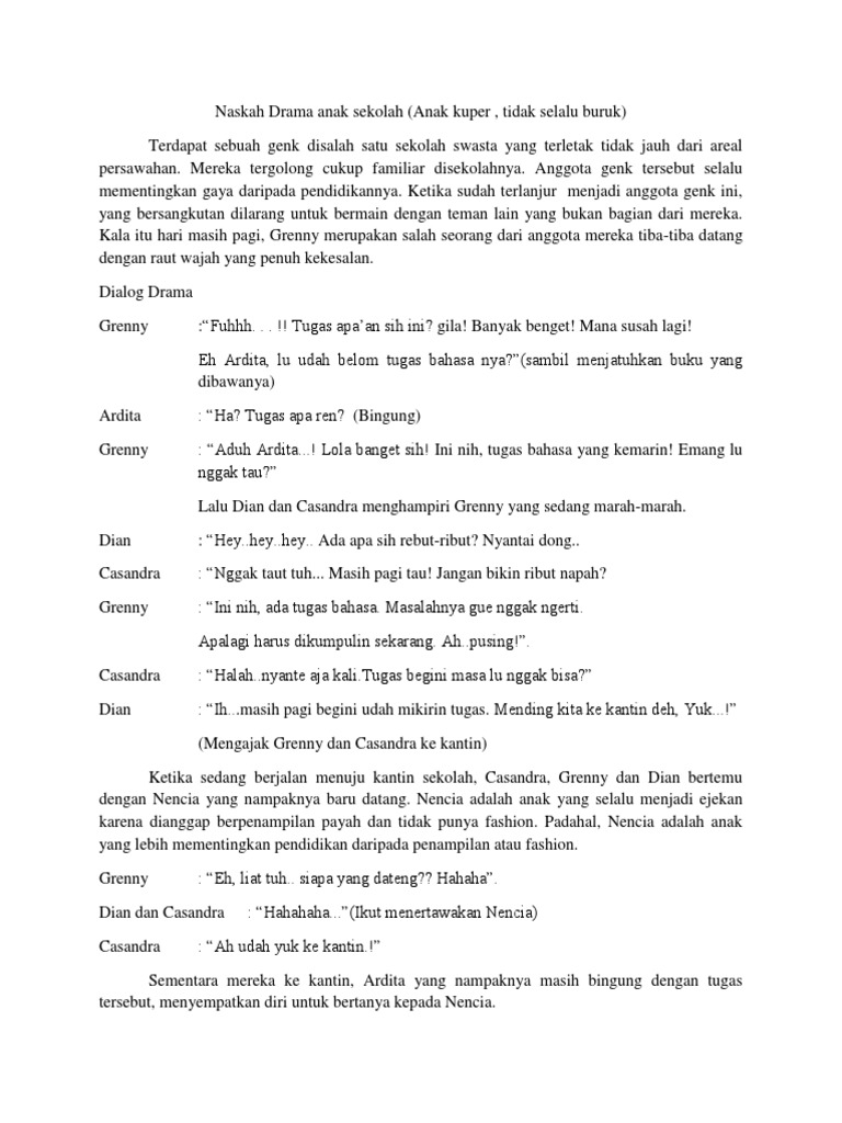 Contoh drama anak sekolah. Contoh naskah drama anak sekolah. Pementasan drama disebut juga dengan istilah teater di sekolah ataupun di kampus kampus biasanya ada satu wadah ekstrakulikuler yang mewadahi seni drama ini. Semenjak setahun ke belakang negara memberikan program terbaru yakni beasiswa kepada para siswa yang memiliki prestasi di sekolah. Contoh naskah drama pendek 5 orang. Contoh naskah drama anak dalam bahasa inggris terbaru. Contoh drama mungkin sebagian dari anda pernah melakukan drama ataupun pernah menonton pementasan drama.