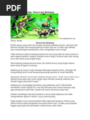 Contoh fabel bahasa inggris. Teks fabel menjadi menarik karena di dalam ceritanya apapun bisa terjadi termasuk hal yang tidak mungkin. Cerita tersebut tidaklah mungkin sebuah kisah nyata. Jika sahabat sudah bisa memahami makna kemudian susunan syarat syarat dimana sebuah cerita masuk dalam kategori fabel maka akan sangat mudah membuatnya sendiri. Perbedaan fabel dan legenda beserta contoh dalam bahasa inggris. Lebah dan semut admin yakin sebagian besar anak anak di indonesia bahkan dunia menyukai cerita dongeng fable dan lain sebagainyaanak anak itu pasti merasa antusias jika mendengarkan dongeng atau fable yang kita sampaikan. Menurut oxford dictionary fable is a short story typically and the characters are from animal conveying the moraljadi fabel merupakan sebuah cerita pendek dimana karakter atu tokohnya adalah hewan hewan.