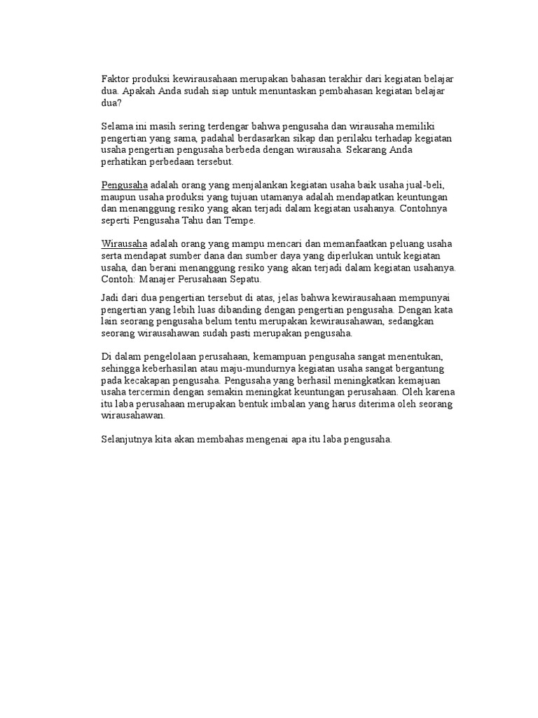 Pengertian faktor contoh kewirausahaan usaha kecil dan franchising 1. Faktor kewirausahaan enterpreneurship faktor kewirausahaan enterpreneurship adalah suatu kemampuan yang dimiliki pada diri seseorang dalam menggunakan faktor faktor produksi sehingga mendapatkan hasil yang diinginkan. Untuk itu diperlukan faktor modal dan kewirausahaan. Faktor sumber daya alam fisik. Pengertian sederhananya adalah segala sesuatu yang dibutuhkan agar kegiatan produksi dapat berjalan dengan lancar. Sedangkan modal kewirausahaan dan sumber daya informasi merupakan faktor produksi turunan.