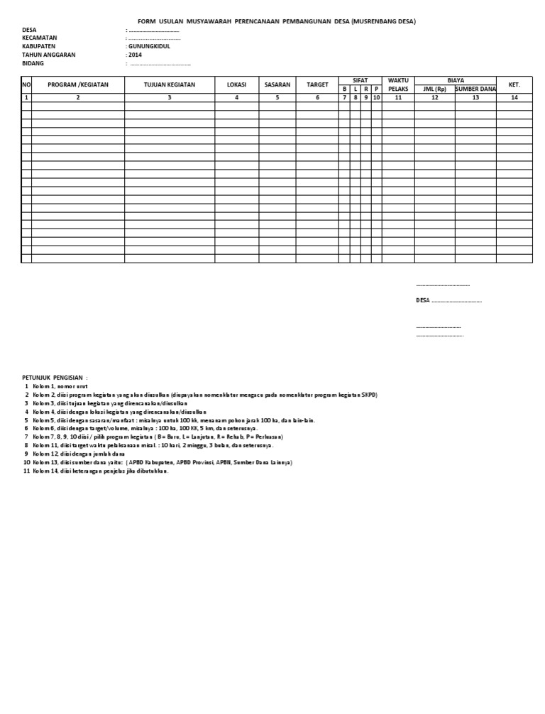 Contoh format usulan musrenbang. Sekretaris dan anggota penyelenggara muswar bisa diambil dari warga masyarakat rkrw yang komitmen dan sukarela untuk membantu penyelenggaraan muswar. Usulan usulan yang bersifat supra desa atau antar desa atau merupakan usulan usulan untuk menjawab masalah daerah dan menjadi kewenangan otoritas skpd dan merupakan masalah dan kegiatan yang terjadi tidak hanya di desa bersangkutan saja akan diajukan kepada skpd skpd pada tahapan musyawarah perencanaan lebih lanjut musrenbang kecamatan dan musrenbang kabupaten. Filenya pasti ada di laptop atau komputer anda. Format isian usulan rtrkrw untuk bidang ekonomi fisik dan sosial alat tulis kertas plano spidol besar isolasi dll. Form usulan musyawarah perencanaan pembangunan desa musrenbang desa tahun anggaran bidang no program kegiatan tujuan kegiatan lokasi sasaran target sifat biaya ket. Tabel 5 kolom 5 6 dan 7 memperlihatkan contoh format yang dapat digunakan untuk mereview usulan program dan kegiatan skpd serta prioritas tahun rencana berdasarkan prakiraan.