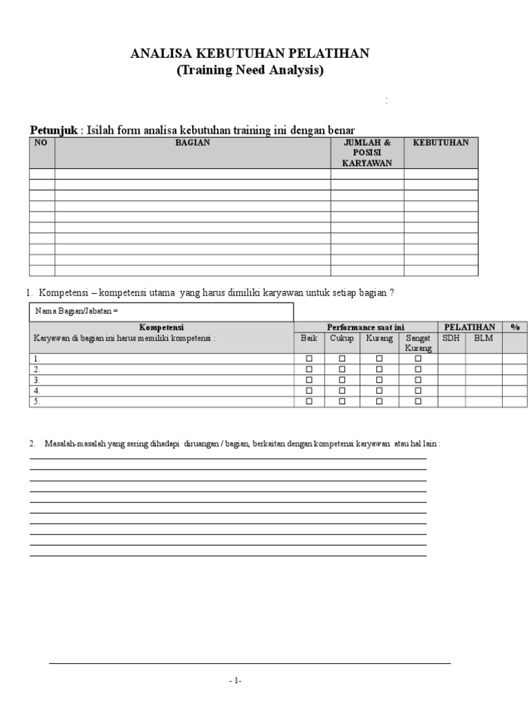 Contoh formulir analisa kebutuhan training. Dari analisis yang paling sederhana pada pelatihan hal ini perlu melalui analisis yang luas dan kompleks dengan melihat peran kerja tugas tugas khusus karyawan dan pemetaan karyawan ke profil kompetensi perusahaan. Berangkat dari uraian di atas maka melalui kajian ini penulis mencoba memaparkan tentang analisa kebutuhan pelatihan terhadap pegawai pada program studi manajemen perkantoran upi. Hal ini dilakukan untuk mengetahui sejauhmana potensi. Tugas dan tanggungjawab posisi ini dianalisa untuk diketahui jenis ketrampilan apa yang dibutuhkan. Kondisi sekarang banyak masyarakat yang masih tinggal di serter serter. Contoh formulir analisa kebutuhan training contoh formulir c7 contoh formulir data pelamar contoh formulir excel contoh formulir interview karyawan baru contoh formulir iumk contoh formulir lomba futsal contoh formulir notulen rapat contoh formulir open recruitment contoh formulir organisasi contoh formulir quality control.