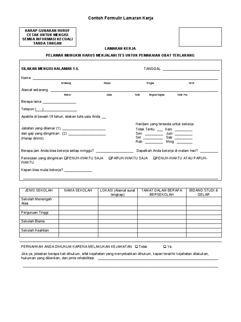 Contoh formulir lamaran kerja. Simpan simpan contoh formulir lamaran kerja 1pdf untuk nanti. 3surat lamaran kerja hendaknya ditulis secara manual dan memang anda yang membuatnya 4lengkapi dengan data data yang dibutuhkan oleh perusahaan tempat anda melamar kerja 5lampirkan surat pendukung lainnya seperti sertifikat pengalaman kerja contoh surat lamaran kerja bali 20 maret 2018 kepada yth. Surat lamaran kerja 4 surat niaga 2 surat panggilan 1 surat pembaca 1 surat pemberitahuan 7 surat penawaran 8 surat pengantar 2 surat pengunduran diri 1 surat peringatan 1 surat perintah 5. Gunakan bahasa resmi pastikan setiap melamar pekerjaan gunakan format surat bisnis yang resmi. Surat lamaran kerja dibutuhkan guna melamar pekerjaan baru untuk kamu yang baru lulus kuliah pindah kerja cari suasana baru maupun fresh graduate. Pengisian formulir ini harus dengan huruf cetak dan diisi oleh pelamar sendiri 2.