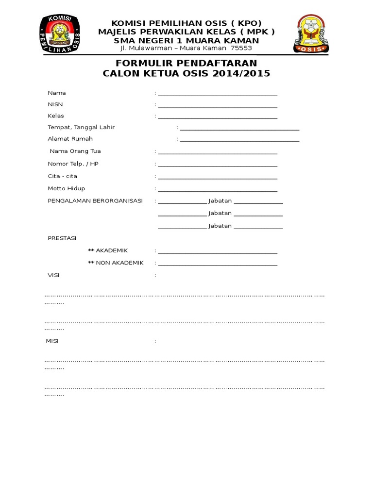Contoh formulir pendaftaran organisasi pramuka materi pelajaran 7. Dalam pemilihan pengurus osis perlu diadakannya pendaftaran. Murid untuk mengikuti pendaftaran pengurus osis masa bhakti 20162017. Formulir pendaftaran osis baru 2014 2015 sma marsudirini bekasi. Formulir pendaftaran calon ketua dan wakil ketua osis sman pintar kuantan singingi periode 20122013 1. Contoh formulir pendaftaran calon ketua osisdoc demikian formulir yang dapat dibagikan dalam postingan kali ini.
