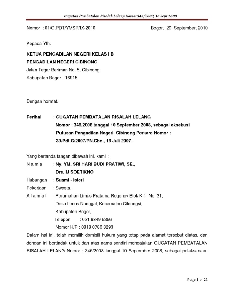 Contoh gugatan pembatalan lelang. P 25 bc2007 bcf 15 sebagai daftar barang impor yang dinyatakan sebagai barang yang dikuasai oleh negara. Penetapan pengadilan disampaikan secara tertulis dan harus sudah diterima oleh pejabat lelang paling lama sebelum lelang dimulai. Pembatalan lelang sebagaimana dimaksud pada ayat 1 disampaikan secara tertulis dengan disertai alasan dan harus sudah diterima oleh pejabat lelang paling lama sebelum lelang dimulai. Dalam hal terjadi pembatalan sebelum lelang sebagaimana dimaksud pada ayat 1 penjual dan pejabat lelang harus mengumumkan kepada peserta lelang pada saat pelaksanaan lelang. Contoh surat pencabutanpembatalan surat pengunduran diri dari perusahaan saat kita bekerja pasti ingin berpindah kerja ke tempat yang lebih menjanjikan. Dari pengalaman advokasi kami seputar gugatan pembatalan lelang atas jaminan yang dibebani dengan hak tanggungan kami menemukan adanya celah hukum bagi debitur untuk menggugat pembatalan lelang hak tanggungan dengan dalil misalnya adanya perbuatan melawan hukum atau penyalahgunaan keadaan misbruik van omstadigheden pada waktu pembuatan perjanjian utang piutang sebagai perjanjian pokoknya.
