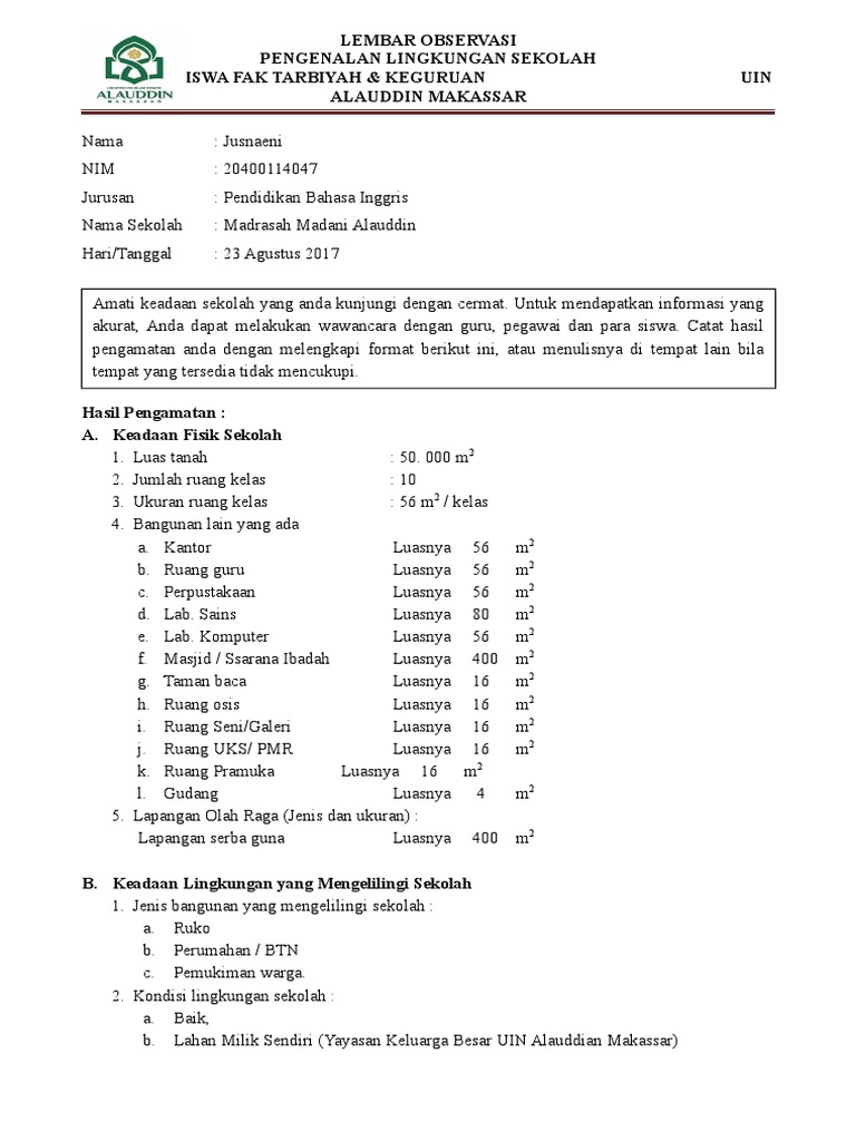 Contoh hasil observasi lingkungan sekolah. Membuat contoh laporan hasil observasi lingkungan sekolah pun tidak jauh berbeda dengan laporan observasi yang lainnya. Demikianlah hasil observasi dari lingkungan smp padamulya bandung yang terdiri dari lingkungan benda hidup dan lingkungan benda mati. Smp sukamulya bandung yang berlokasi di jalan macan no. Teks laporan report ini juga disebut teks klasifikasi karena memuat klasifikasi mengenai jenis jenis sesuatu berdasarkan kriteria. 23 bandung ini adalah salah satu sekolah yang memiliki kondisi lingkungan sehat dan bersih karena sekolah ini memiliki 2 jenis lingkungan yaitu lingkungan hidup atau benda hidup yang disebut juga biotik dan lingkungan mati atau benda mati yang sering disebut dengan. Universal berarti teks laporan hasil observasi tidak tendensi atau memihak pada satu pihak tertentu.