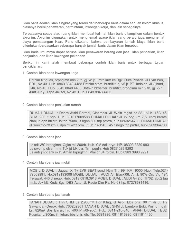 Contoh iklan baris penawaran abdi bangunrumah kwlts bgs bata mrah baja rngan kusen meranti hub08120987659 0877878769456 bgn rmh matrial tnp dp 2jtm tkt 3jtm. Iklan baris adalah salah satu jenis promosi barang dan jasa di koran dalam bentuk teks singkat yang terbatas. Contoh iklan baris pengertian iklan baris adalah salah satu jenis promosi iklan barang atau jasa di koran dalam bentuk teks singkat terbatas. Misalnya iklan baris yang membahas promosi properti maka di dalamnya hanya ada berbagai penawaran rumah dan sejenisnya. Saya kemaren udah baca dok kalau kemaren anda sudah baca ya baca lagi aja. Contoh iklan baris sendiri jika di temui di koran maka akan terkumpul dalam satu halaman.