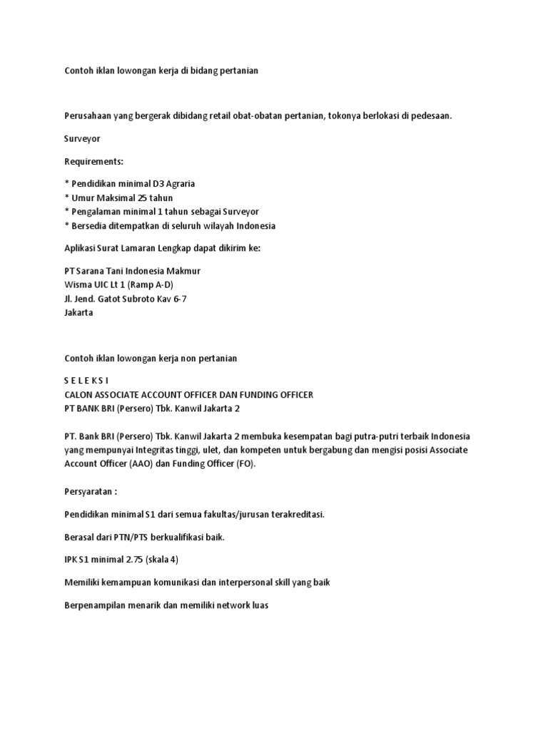 Iklan lowongan kerja adalah iklan di surat kabar atau koran yang sering kita temui. Membaca iklan lowongan pekerjaan baik melalui internet maupun koran bukan hal yang baru untuk sebagian kalangan. Salah satunya bisa saja cocok dengan kualifikasi pekerjaan yang anda harapkan. Untuk itu haruslah anda buat iklan lowowngan kerja bagi perusahaan atau pengumuman penerimaan karyawan pegawai bagi instansi atau. Semoga bisa menjadi contoh referensi kalian shabata sbi. 15 contoh surat lamaran kerja berdasarkan iklan paling lengkap salah satu sumber informasi tentang lowongan pekerjaan adalah melalui iklan.