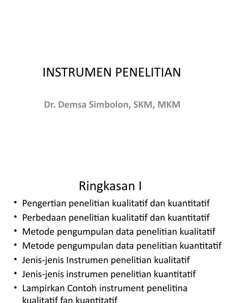 Instrumen penelitian adalah alat bantu yang dipergunakan oleh si penelitian dalam mendapatkan hasil riset yang berkwalitas selain itu dengan adanya keterangan terhadap instrumen penelitian seseorang pembaca hasil penelitian dalam menentukan teknik analisis data kuantitatif kualitatif yang dipergunakan. Peneliti sebagai instrumen penelitian menekankan pentingnya perspektif subjektif peneliti. Penjelasan mengenai keadaan tersebut tentusaja tidak cukup dalam. Penelitian kuantitatif mengambil jarak antara peneliti dengan obyek yang diteliti menggunakan instrumen instrumen formal standar dan bersifat mengukur. Penelitian sosial kualitatif memandang penting sudut pandang peneliti dalam memberikan gambaran tentang dunia yang ditelitinya. Instrumen penelitian kualitatif kuantitatif dan pengembangan.