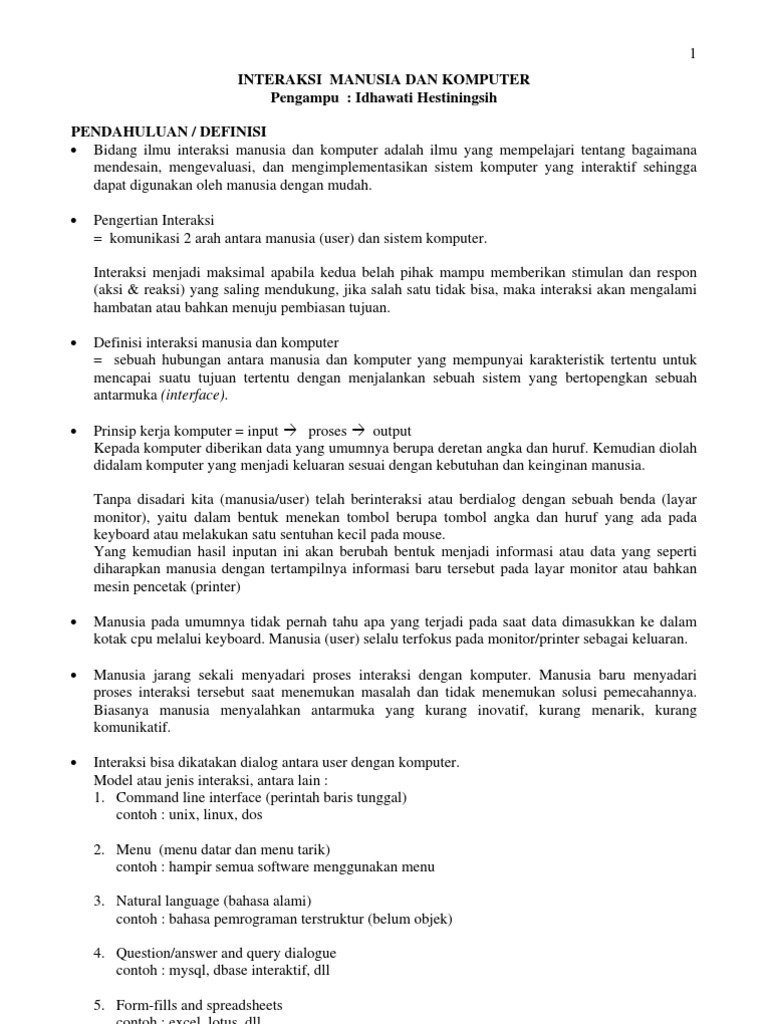 Contoh interaksi manusia dan komputer. Interaksi manusia dan komputer adalah serangkaian proses dialog dan kegiatan yang dilakukan oleh manusia untuk berinteraksi dengan. Walaupun begitu kita perlu suatu pengetahuan tentang pentingnya hubungan antara manusia dan komputer hal ini berguna jika kita ingin memperoleh dan mengembangkan materi pendidikan atau menciptakan suatu software maupun hardware. 3 definisi interaksi manusia dan komputer. Menghasilkan sistem yang dapat digunakan usable memiliki manfaat useful dan mudah dioperasikan oleh pengguna user friendly. Sekarang ini tidak ada definisi yang disetujui menyangkut topik yang membentuk area interaksi manusia dengan komputer. Humancomputer interaction atau disingkat hci adalah disiplin ilmu yang mempelajari hubungan antara manusia dan komputer yang meliputi perancangan evaluasi dan implementasi antarmuka pengguna komputer agar mudah digunakan oleh manusia.