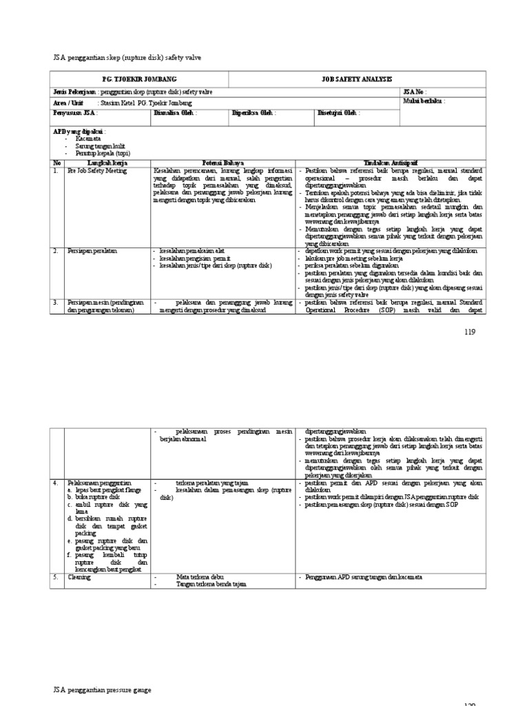 Lengkapi jsa untuk pekerjaan melepas block valve ukuran 20 inchi pada kasus ini. Isi nama pengawas pekerja tanggal pekerjaan. Nomor dan nama pekerjaan nomor dan nama jabatan seksidepartemen jabatan superior 045 konstruksi sipil umum general helper hrga general affair group leader tanggal disusun oleh diperiksa oleh disetujui oleh 28 desember 2008 tanda tangan tanda tangan tanda tangan lokasi kerja. Jsa sangat penting agar seluruh pekerja yang terlibat dalam pekerjaan menyadari bahaya yang. Rencana keselamatan konstruksi adalah dokumen lengkap prencana penerapan sistem manajemen keselamatan konstruksi smkk dan merupakan satu kesatuan dengan dokumen kontrak suatu pekerjaan konstruksi yang dibuat oleh penyedia jasa dan disetujui oleh pengguna jasa untuk selanjutnya dijadikan sebagai sarana interaksi antara penyedia jasa dengan pengguna jasa dalam penerapan smkk. Jsashe045 no revisi direview tanda.