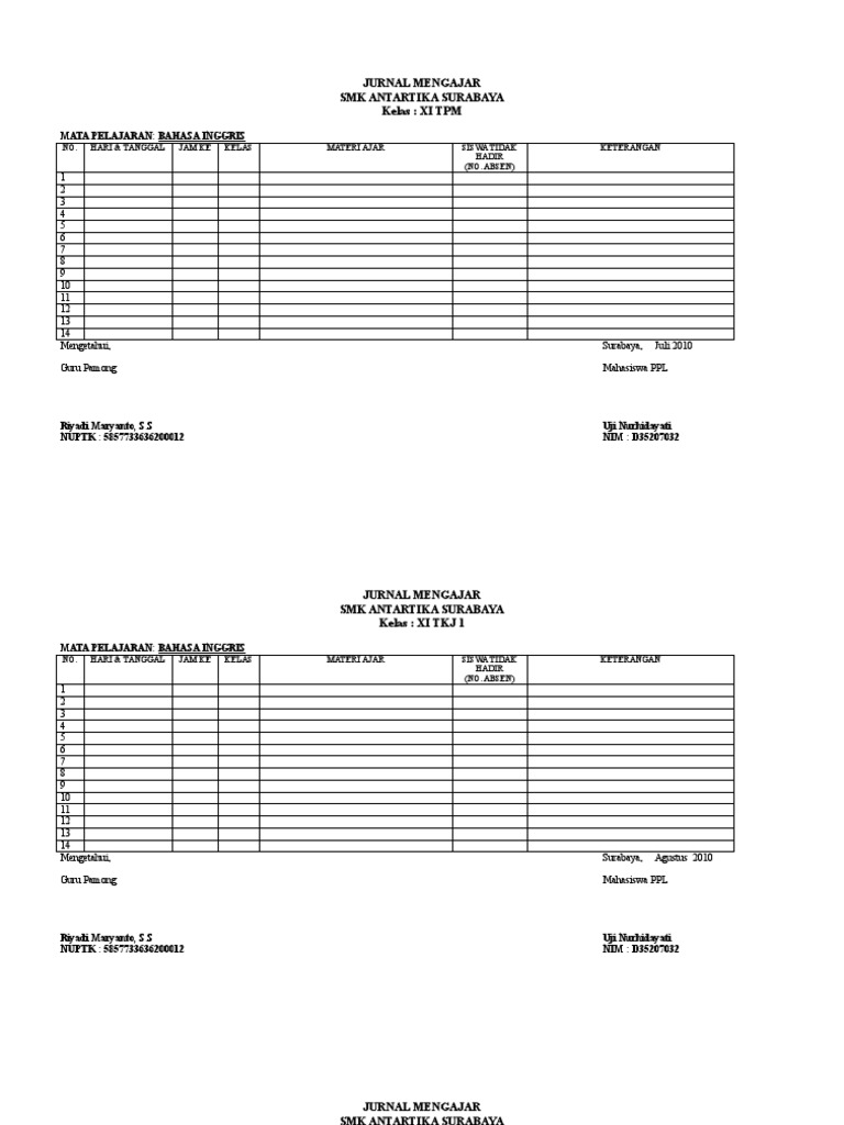 Kang ali lihat profil lengkapku. Contoh jurnal agenda guru yang mungkin anda butuhkan saat inimaka tepat sekali mengunjungi blog kami karena dalam kali ini kami akan memudahkan anda semua dalam mencari tentang contoh jurnal harian guru kurikulum 2013 dan format jurnal mengajar guru kami pastikan anda mendapatkan file download jurnal guru secara lengkap untuk bahan pesiapan menghadapi tahun ajaran baru 2017 2018. Kelas 6 tema 8doc. Bagian bawah diberikan tanda tangan guru dan mengetahui kepala sekolah. Contoh buku agenda guru. 196401091985011002 jurnal mengajar guru smp negeri 7 jember tahun pelajaran 20142015 no haritgl mapel kls jam kdtemakegiatan ket jember.