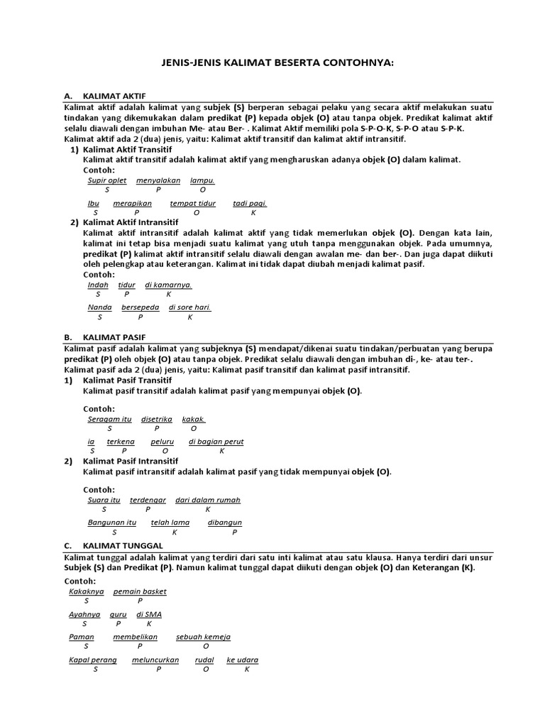 Kalimat aktif transitif intransitif ekatransitif dan dwitransitif. Kalimat ini mempunyai beberapa jenis dimana dua diantara jenis jenis kalimat aktif tersebut adalah kalimat aktif transitif dan kalimat intransitif.