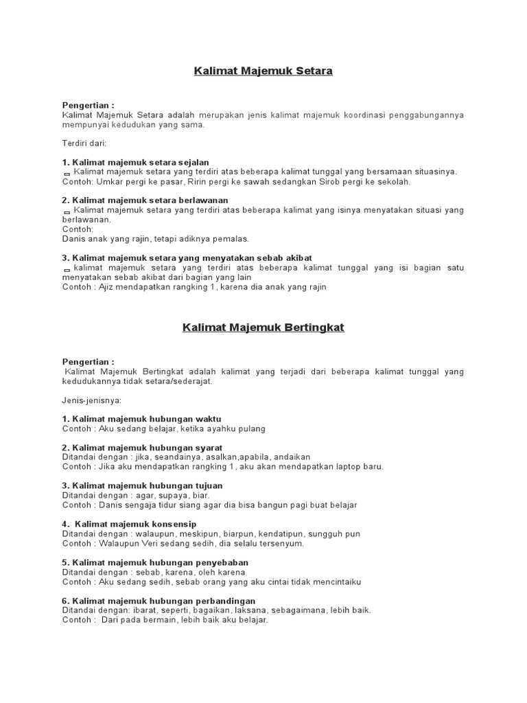 Hubungan pertentangan yang menyatakan penguatan sebuah paragraf dapat dikatakan sebgai paragraf pertentangan yang menyatakan penguatan jika kalimat kedua pada paragraf itu menguatkan informasi yang dinyatakan pada kalimat pertama. Pada paragraf perbandingan fungsinya adalah untuk menemukan kelebihan dan kekurangan dari 2 hal yang berbeda benda kalimat maupun lainnya misalnya saja kecepatan mobil dan sepeda motor. Di dalam kalimat majemuk bertingkat atau kalimat majemuk hubungan perbandingan ini memiliki beberapa kata yang menjadi ciri khas di dalamnya seperti. Biasanya dalam soal perbandingan terdapat perselisihan umur berat badan tinggi badan nilai pelajaran dan lain sebagainya. Kalimat majemuk hubungan sangkalan kalimat majemuk ini ditandai oleh konjungsi seolah olah seakan akan. Membuat kalimat majemuk setara.