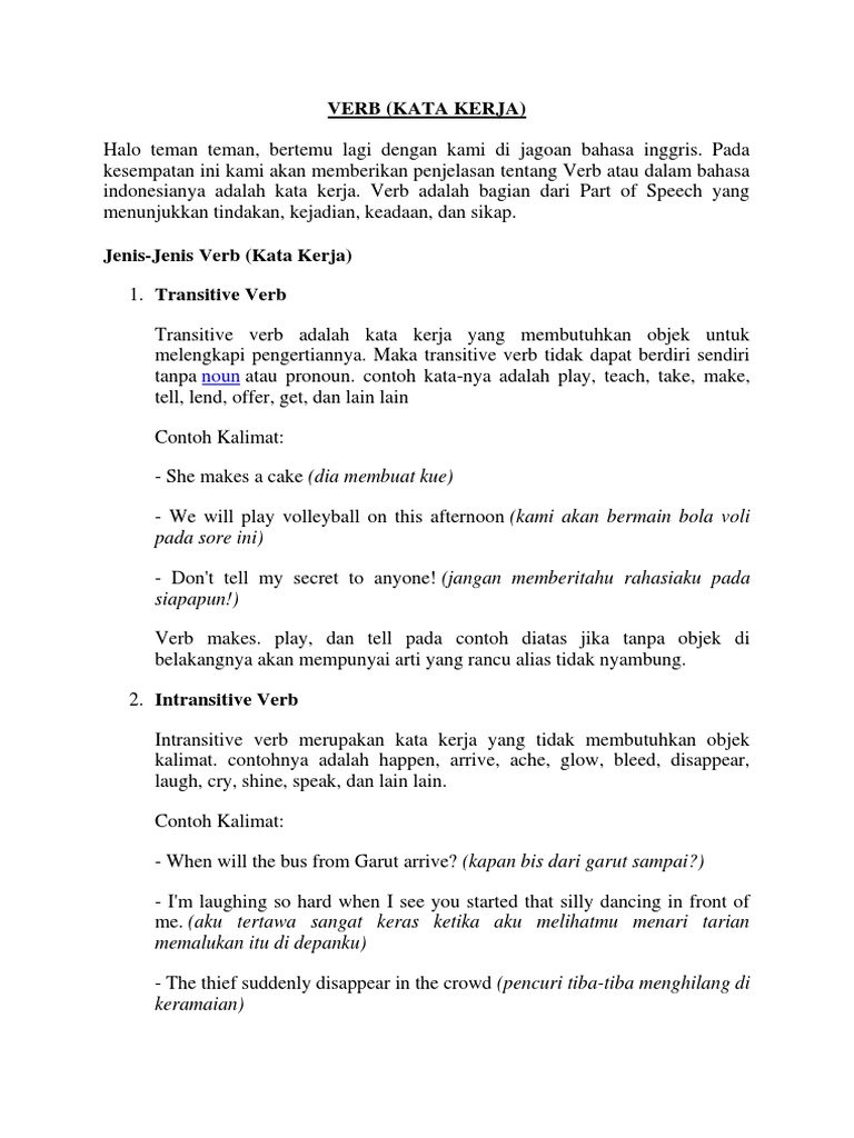 Transitive dan intransitive verb regular dan irregular verb action dan stative verb finite dan non finite verb linking verb dan causative verb. Nah sahabat azbi untuk lebih jelasnya kita simak yuk contoh contoh kalimat yang menggunakan kata kerja dalam bahasa inggris baik kalimat positive negative dan introgative biar sahabat azbi gak bingung lagi dengan contoh kata kerja dalam bahasa inggris. Semoga dengan membaca contoh kamu mulai paham penggunaan kata kerja dalam bahasa inggris. Verb dapat dikelompokkan menjadi. Di dalam kalimat helping verb atau kata kerja bantu berada di depan kata kerja utama dan berfungsi untuk membantu kata kerja utama dalam menunjukan konteks makna dan waktu dalam sebuah kalimat. Contoh kalimat verb kata kerja bahasa inggris macam macam verb.