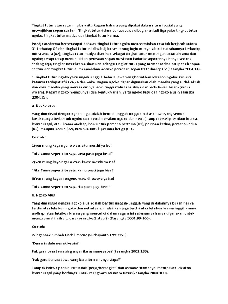 Contoh soal dan jawaban bahasa daerah bahasa jawa buatlah kalimat dari bahasa jawa ngoko lugu di ubah ke krama alus. Mengko soré yèn sida aku arep lunga menyang surabaya. Belajar kalimat bahasa jawa ngoko lugu dan ngoko alus disertai contoh soal belajar kalimat bahasa jawa ngoko lugu dan ngoko alus pelajaran bahasa jawa merupakan muatan lokal untuk provinsi jawa tengah. Ngoko versi baru dibagi menjadi dua. Bahasa ngoko dibagi menjadi 2 jenis bahasa yaitu ngoko lugu dan ngoko andhap yang dibagi ke dalam 2 jenis bahasa yaitu antya basa dan basa antya. Ibu mangan bapak maca koran simbah lara untu pak toni numpak sepur dan bu ratna nggawa tas.