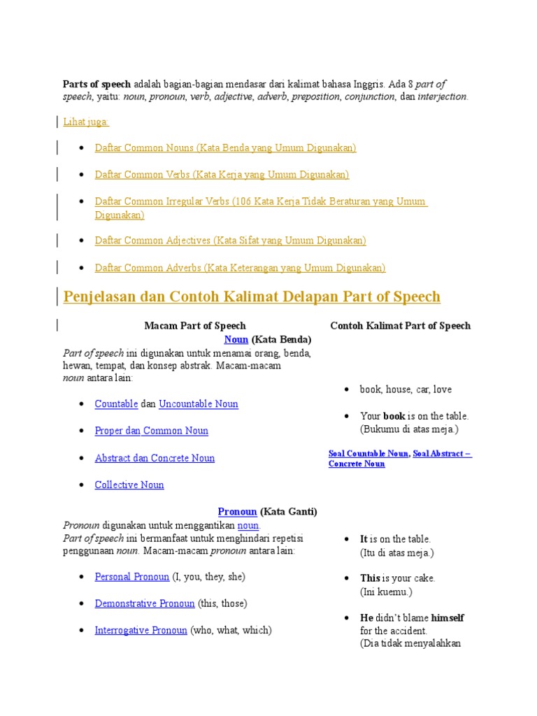 Contoh kalimat part of speech. Noun pronoun adjective verb adverb preposition conjunction dan interjection. Dalam bahasa inggris terdapat delapan jenis part of speech atau yang lebih dikenal sebagai kelas kata yakni. Berdasarkan fungsinya dalam kalimat verb dibagi menjadi dua yaitu sebagai kata kerja bantu dan kata kerja utama. Adverb kata keterangan part of speech ini berfungsi untuk menjelaskan kata kerja verb kata sifat adjective. Secara istilah parts of speech dapat dikatakan sebagai parts of speech is a class of words based on the words function the way it works in a sentence. Macam macamnya antara lain countable dan uncountable noun proper dan common noun abstract dan concrete noun dan collective noun.