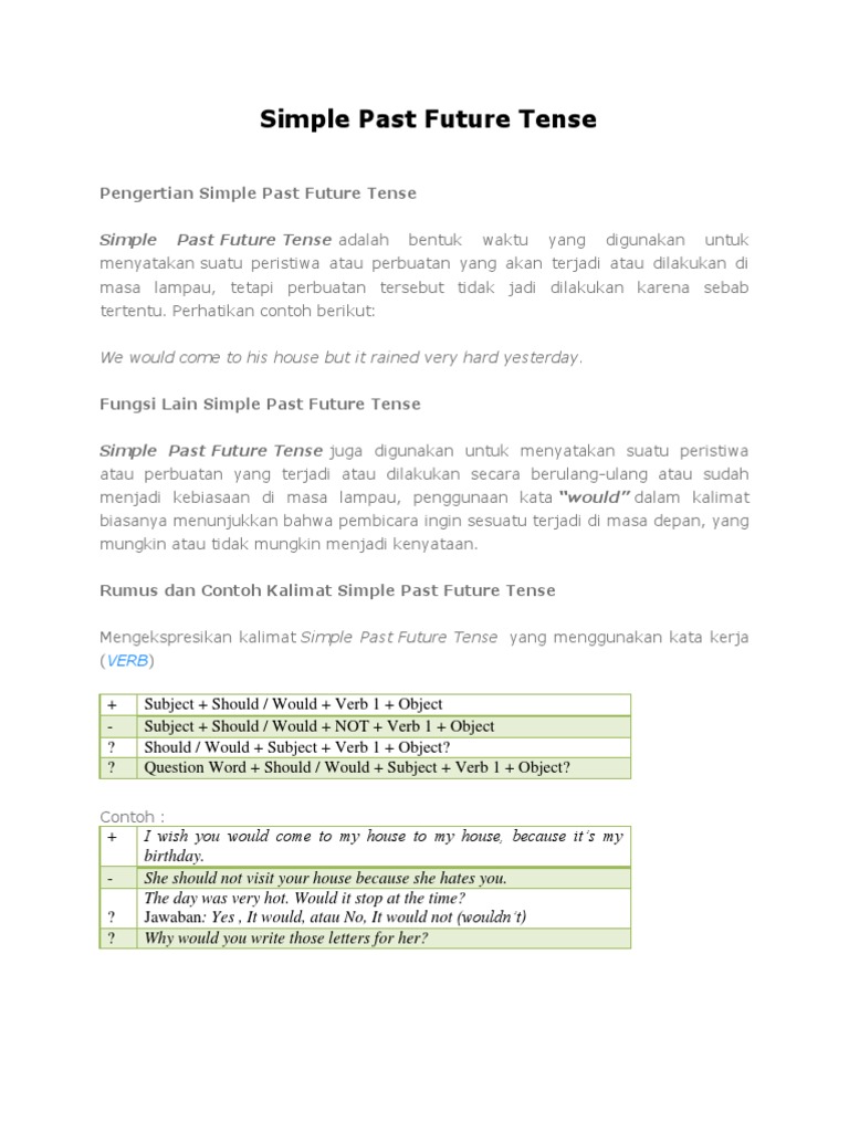 Iya memang benar kita akan mengulik simple future tense dalam hal contoh contoh kalimatnya dalam bahasa inggris lebih banyak lagi agar kalian memahami penggunaannya dalam suatu kalimat. Contoh kalimat past future perfect tense i could have bought that car but i prefered to save money and wait for the manual version. Simple past future tense waktu lampau sederhana yang akan dilakukan adalah bentuk waktu untuk tindakan atau kegiatan yang akan dilakukan pada masa lampau. Hal yang harus diperhatikan dalam membuat contoh kalimat past tense adalah memberikan keterangan waktu adverb of time agar pembaca atau orang yang diajak bicara dapat memahami bahwa pekerjaan yang kita maksud terjadi. Will i be bitten by the dog.