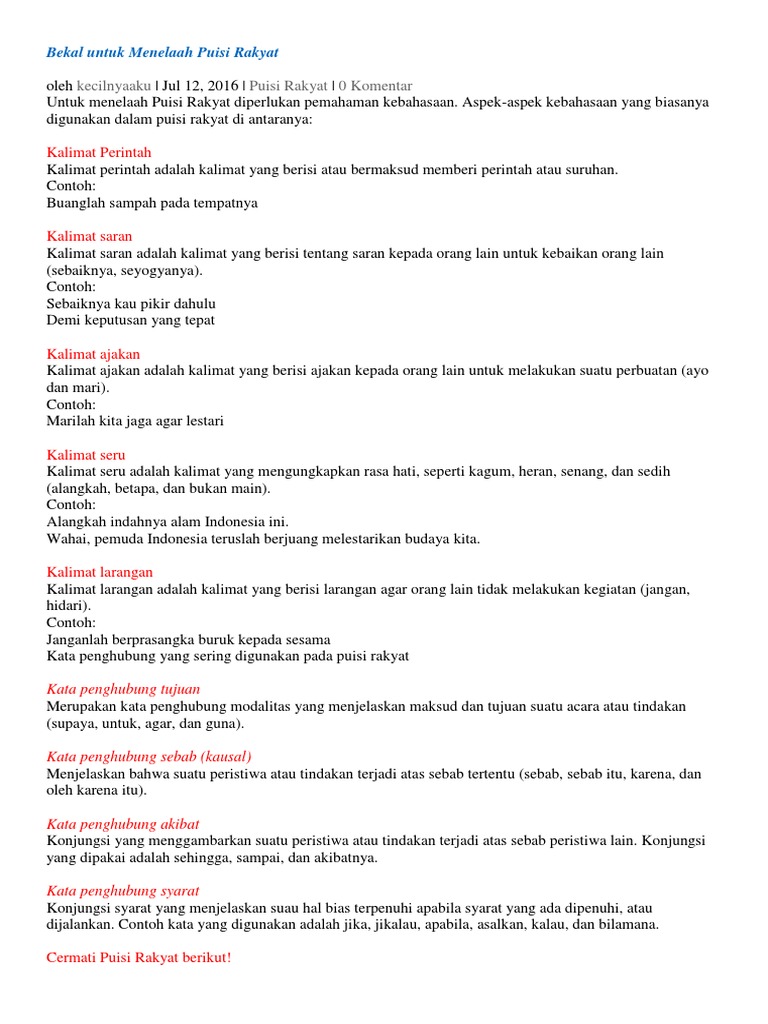 Kalimatnya bersifat mengajak atau membujuk seseorang untuk melakukan sesuatu hal. Selain ditandai pola intonasi suruh kalimat ajakan juga ditandai dengan kata kata ajakan seperti mari marilah ayo dan ayolah. Mari kita ramai ramai membersihkan jalan. Ciri ciri kalimat perintah umumnya diakhiri oleh sebuah tanda seru. Kalimat ajakan ditujukan untuk menyampaikan sebuah ajakan kepada seseorang atau sekelompok orang. Marilah belajar ke perpustakaan.