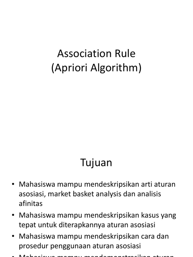Association rule merupakan pendekatan eksplorasi data yang sering digunakan atau diterapkan pada kumpulan data yang sangat besar. Mencari large itemset dalam penetapan association rule. Langkah atau cara kerja apriori 5. Definisi definisi yang terdapat pada association rule 4. Latihan soal 3 9. Association rule mining adalah analisa dari kebiasaan belanja konsumen dengan mencari asosiasi dan korelasi antara item item berbeda yang diletakkan konsumen dalam keranjang belanjaannya.