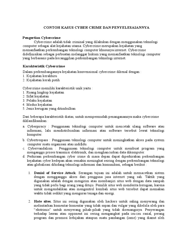 Cybercrime merupakan kejahatan yang memanfaatkan perkembangan teknologi computer khusunya internet. Contoh kasus cyber crime dan penyelesaiannya pengertian cybercrime cybercrime adalah tidak criminal yang dilakukan dengan menggunakan teknologi computer sebagai alat kejahatan utama. Cybercrime didefinisikan sebagai perbuatan melanggar hukum yang memanfaatkan teknologi computer yang berbasasis. Contoh kasus cyber crime dan penyelesaiannya.