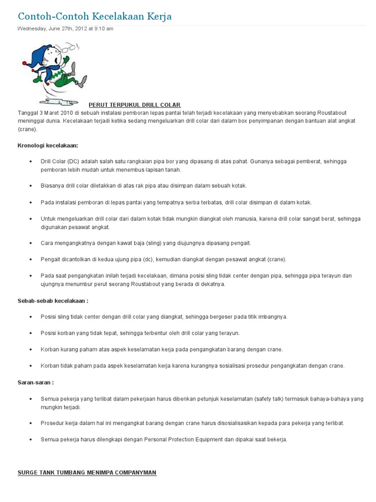 Jatuh dari ketinggian 40 meter pekerja tambang batu kapur di tuban tewas. 3 contoh kasus kecelakaan kerja penyebab kecelakaan kerja dunia usaha indonesia saat ini sedang menghadapi perubahan besar dan cepat sebagai dampak globalisasi dan liberalisasi perdagangan dunia sehingga perlu meningkatkan daya saing dengan memproduksi barang dengan mutu terbaik pada tingkat harga yang kompetitif. Kecelakaan kerja pada karyawan di mesin dinamo pabrik bagian pakaian korban yang tersangkut puli dinamo yang sedang berputar musibah bermula sebelumnya sekitar pukul 0740 saat akan dilakukan penggantian jam kerja korban mengambil sampel lateks dibagian produksi. Contoh kasus kecelakaan kerja di proyek konstruksi jenis jenis kecelakaan yang dapat terjadi di sektor industri beberapa industri nampaknya harus lebih hati hati dan memperhatikan keselamatan kerja para pegawainya karena beberapa industri di bawah ini adalah industri yang mempunyai tingkat kecelakaan kerja cukup tinggi. Terbaru sebuah box girder pada proyek light rail transit lrt runtuh di utan kayu jakarta timur senin 2212018 dini hari. Empat pekerja di pabrik gula tewas tersiram air panas cilacapempat pekerja cleaning servis di pabrik gula rafinasi pt darma pala usaha sukses cilacap jawa tengah rabu 290709 tewas setelah tersiram air panas didalam tangki.