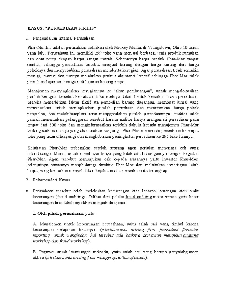 Contoh kasus kecurangan dalam perusahaan. Pemikiran tentang tanggung jawab auditor dalam mendeteksi fraud sering ditamsilkan dengan dua jenis anjing ini. Penelitian coso tersebut dengan menelaah tuduhan kecurangan laporan keuangan yang diselidiki oleh securities and exchange commission sec dalam kurun waktu sepuluh tahun antara tahun 1998 2007 menemukan fakta bahwa berita dugaan kecurangan telah mengakibatkan penurunan abnormal harga saham rata rata 167 dalam dua hari setelah diumumkan. Kriminal disini berarti setiap tindakan kesalahan serius yang dilakukan dengan maksud jahat. Contoh kasus audit etika profesi. Atas rahmat nya yang telah dilimpahkan kepada kami sehingga kami dapat menyelesaikan makalah yang berjudulkasus kecurangan pajak yang merupakan salah satu tugas kelompok yang diberikan dosen mata kuliah akuntansi perpajakan di semester iv. Manipulasi laporan keuangan waskita karya sejak pertengahan agustus 2009.