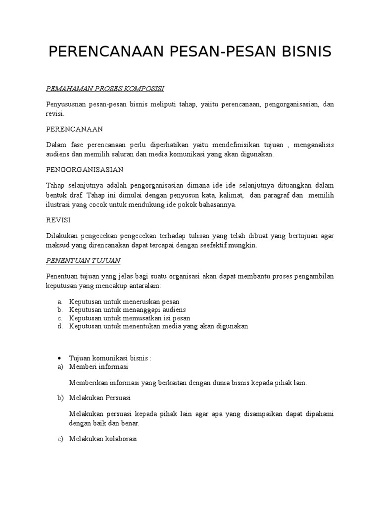 Tanpa adanya pesan bisnis maka informasi informasi yang seharusnya disampaikan tidak dapat tersampaikan. Makalah perencanaan pesan pesan bisnis disusun untuk memenuhi tugas komunikasi bisnis dosen pengampu. Didalam komunikasi bisnis sendiri adanya pesan bisnis dianggap penting demi dapat mencapai tujuan bisnis maupun harapan yang ingin dicapai. Perencanaan pesan bisnis adalah suatu proses komposisi penyusunan pesan bisnis. Perencanaan pesan dalam tahap ini ditentukan hal hal yang mendasar dari suatu pesan yang. 2b pendidikan ekonomi fakultas ilmu pengetahuan sosial dan keolahragaan universitas pgri.