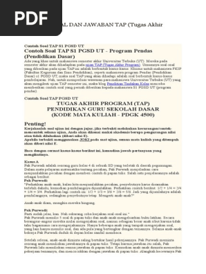 Pada tulisan berikutnya kami akan memberikan bagaimana contoh jawaban untuk kedua kasus pembelajaran di atas. Soal tap ut pgsd kasus pak sartono berikut ini adalah salah satu contoh kasus yang dialami oleh pak sartono yang bisa teman teman pelajari dan simak baik baik bagaimana cara penyelesaian masalahnya. Bab 1 pendahuluan contoh contoh soal dan cara menganalisis. Contoh soal tap s1 pgsd ut program pendas pendidikan dasar ada yang khas untuk mahasiswa semester akhir universitas terbuka ut. Bu is akan mengajarkan ipa dengan topik pernapasan pada manusia di kelas v sd. Mereka pada semester akhir akan dihadapkan pada ujian tap tugas akhir programumumnya soal soal yang diberikan pada ujian tap ini adalah berbentuk kasus kasus.