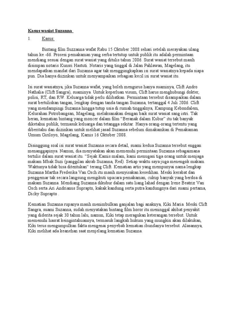 Perebutan harta warisan sebelum membahas contoh kasus perebutan harta warisan saya akan memberikan sedikit hal hal yang bersangkutan dengan undang undang pembagian harta warisan. Istri ayah ibu dan 2 orang anak perempuan dengan bagian masing masing sebagai berikut. Ahli waris dari laki laki tersebut adalah. Kasus diatas termasuk kasus perdata khususnya perikatan karena telah terjadi persetujuan antara juminten dengan susilowati dalam hal jual beli tanah. Hukum perdata berisi tentang hukum orang hukum keluarga hukum waris dan hukum harta kekayaan yang meliputi hukum benda dan hukum perikatan. Pewarisan berdasarkan testamentair artinya.