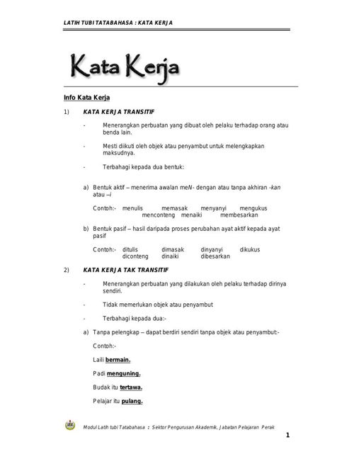Kata kerja aktif biasanya mendapat imbuhan me seperti. Ayat aktif ialah yang menekankan atau mengutamakan si pelakupembuat sebagai subjek dan ayatnya mengandungi kata kerja yang berawalan men me mem men menge dan meny. Contoh kalimat transitif dan intransitif dalam bahasa indonesia kalimat aktif adalah kalimat yang subjeknya melakukan suatu tindakan atau perbuatan. Kalimat aktif intransitif kalimat aktif intransitif tidak bisa diubah menjadi kalimat pasif. Ia sedang tidur di kamarnya. Kata kerja tak transitif berpelangkap ialah kata kerja yang mesti diikuti oleh pelengkap untuk menyempurnakan maksud ayat.