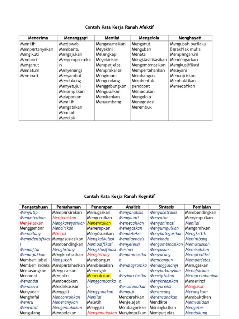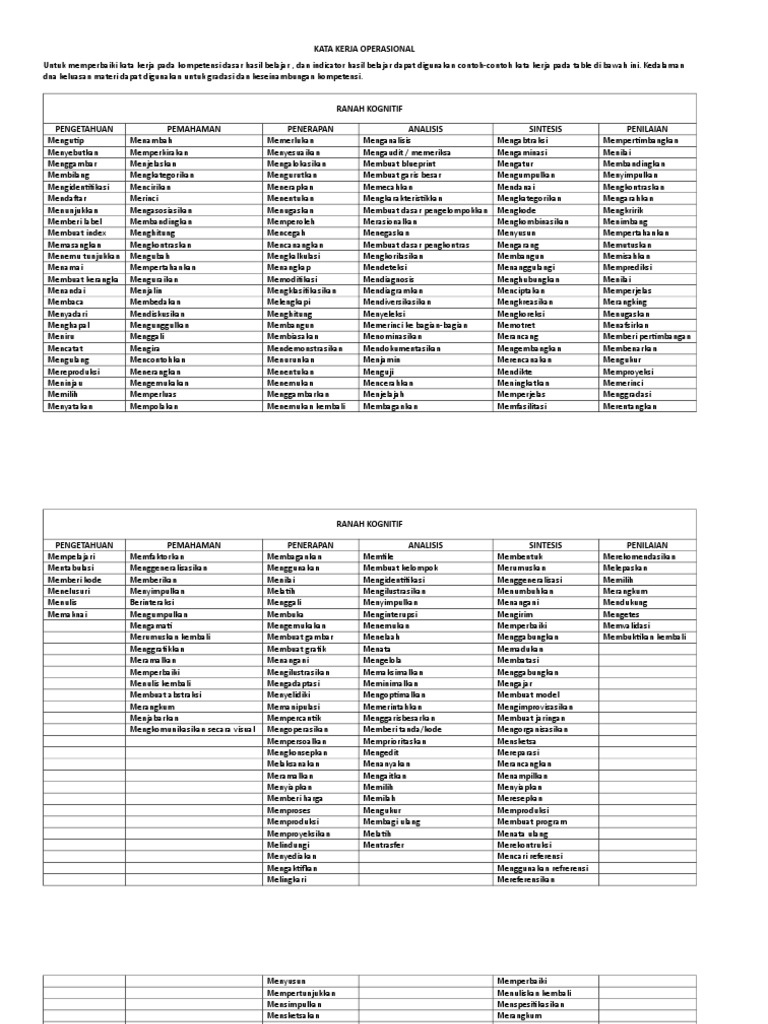 Indicator afektif disusun dengan menggunakan kata kerja operasional dengan objek sikap ilmiah. Kata kerja operasional kko edisi revisi teori bloom ranah kognitif mengingat c1 mengetahui. Dalam setiap aspek taksonomi terkandung kata kerja operasional yang menggambarkan bentuk perilaku yang ingin dicapai melalui suatu pembelajaran. Ranah ini diantaranya kognitif afektif dan psikomotor. Berikut ini adalah contoh kata kerja operasional dari masing masing ranah. Memberi contoh merangkum menyimpulkan membandingkan mengklasifikasikan menunjukkan menguraikan membedakan menyadur meramalkan memperkirakan menerangkan.